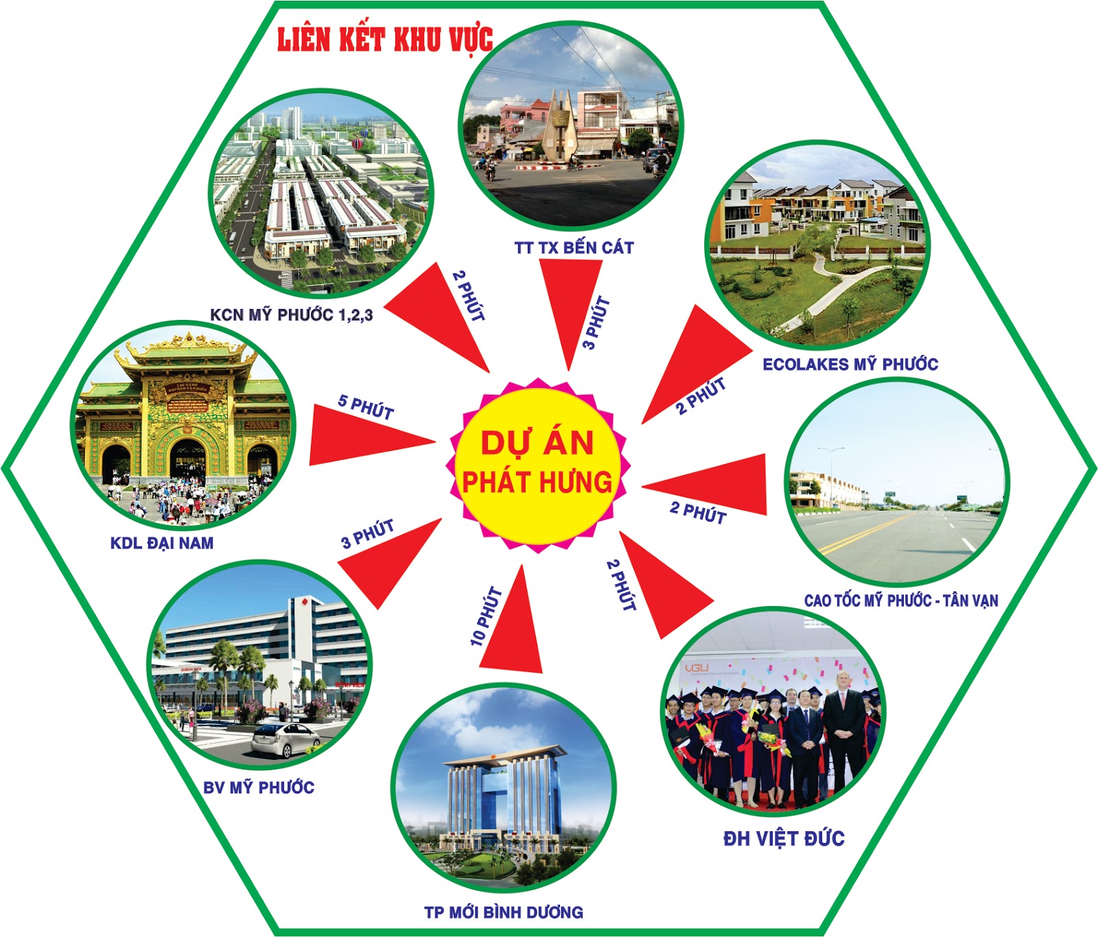 Khu Nhà Ở Phát Hưng Tọạ lạc ngay trên Đại Lộ Bình Dương (mặt tiền Đại lộ BD) là con đường huyết mạch của tỉnh Bình Dương, là tâm điểm giao thông với phía trên là đường Vành Đai 4, sẽ về Đồng Nai, Vũng Tàu, theo hướng Đông, Hướng Tây sẽ về TP HCM, rút ngắn rất nhiều thời gian lộ trình, khoảng cách và tiết kiệm chi phí khá nhiều….Đằng sau là đường Mỹ phước- Tân Vạn 62m giảm tải lưu thông cho Quốc lộ 13.